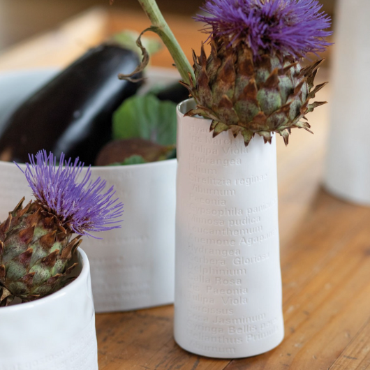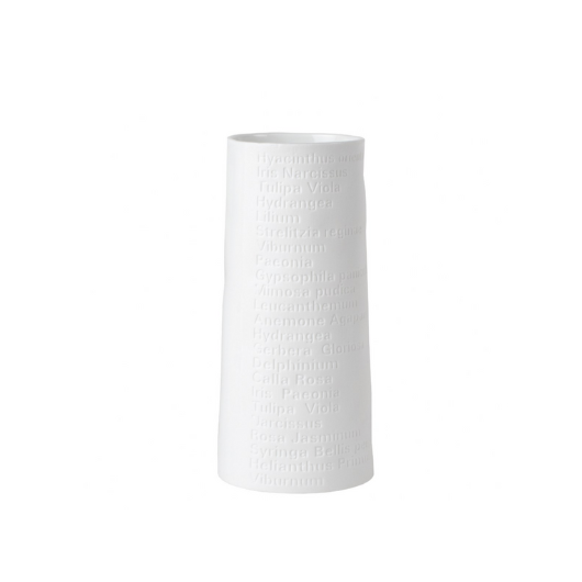 Elegantly crafted from fine porcelain, the Räder Room Poetry Vase features delicate embossed poetic words that add a thoughtful and artistic touch. Perfect for displaying single stems, small blooms, or dried flowers, this vase brings subtle charm and serenity to any space.