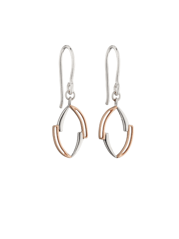 These are stunning asymmetric open navette shaped hook earrings, which are made with rose gold and rhodium plating. The modern design makes them a lovely pair of earrings to style up any look, and they pair beautifully with other silver or rose gold pieces.
