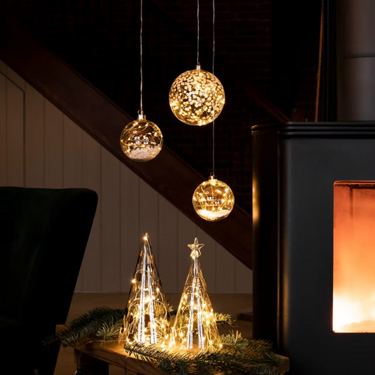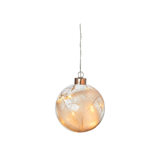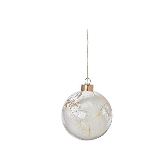 Christmas Feathers LED bauble filled with genuine feathers with a warm white light. battery operated (2xAAA) with a timer 6/18hr. Can be operated with a remote control with infrared receiver module.