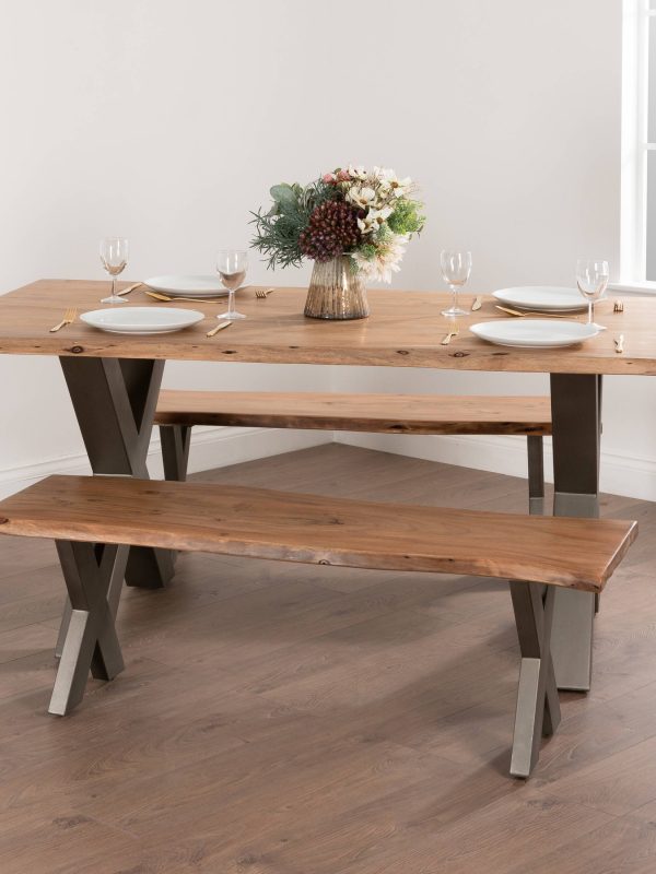 The Live Edge Collection Dining Table is made from Indian acacia wood creating charm and character, this range helps you to bring a feel of the outdoors in by creating a minimal and earthy look. The simplicity of these designs are what makes them so impressive, each piece is complete with a grey metal cross leg design or frame which complements the rustic and natural design of the wood. The live edge feature brings an eye catching design to these pieces and highlights the handmade beauty and authenticity of these products. This particular piece would look ideal teamed with the bench from this collection.