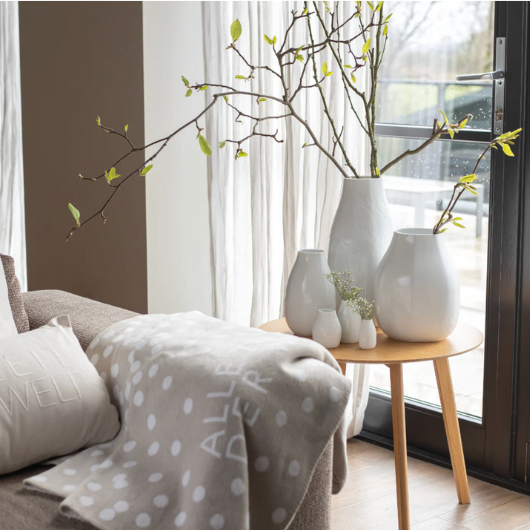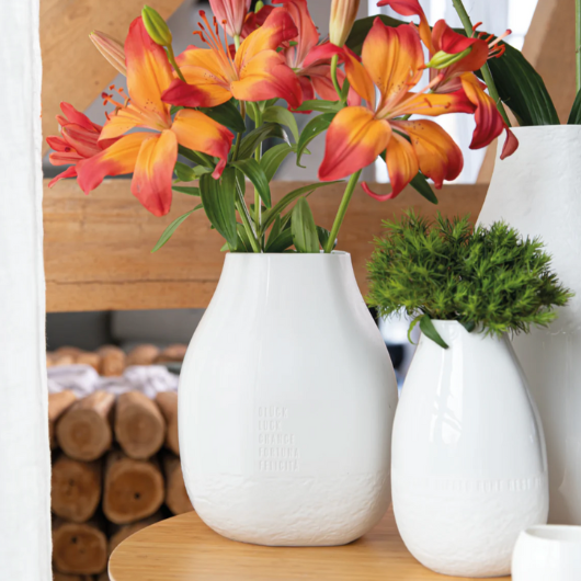 The Freeform Collection celebrates texture, form, and material, uniting classic techniques with contemporary design. Select vases feature embossed multilingual words to infuse your space with meaning and calm — the 7.9″ vase bears Rest, while the 9.8″ vase bears Luck.