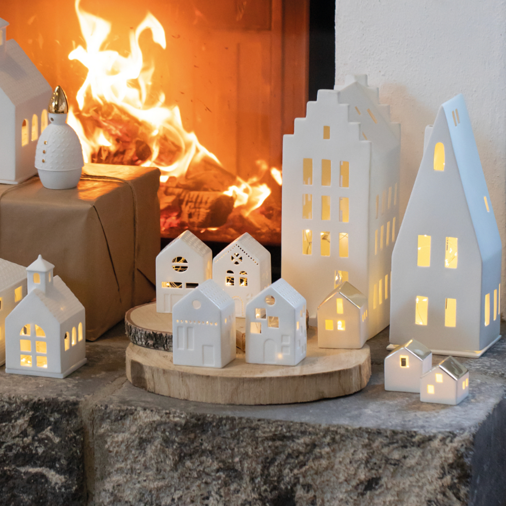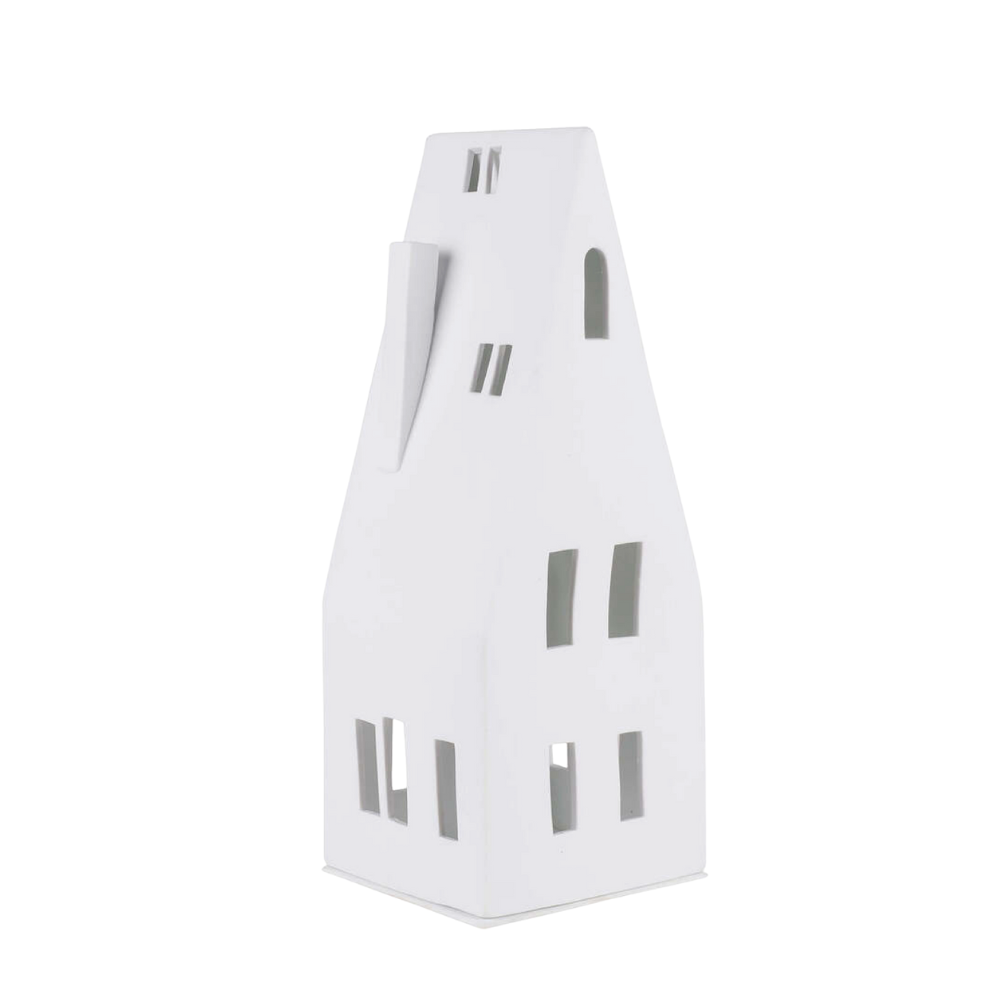 Large Pure white matt porcelain with cut out windows and doors and a steep pitched roof. Simply add a tea light and enjoy beautiful ambient lighting.
