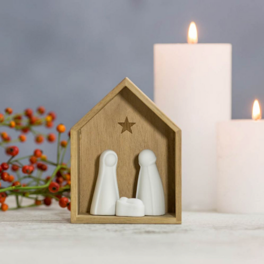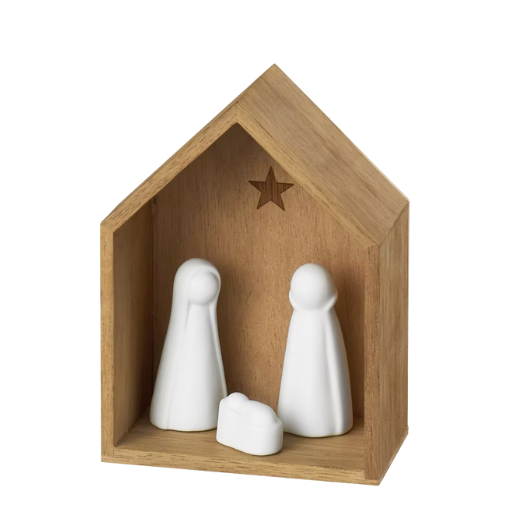 This sweet little acacia wood stable protects the porcelain figures of the Nativity. A very lovely miniature reminder of the meaning of Christmas.