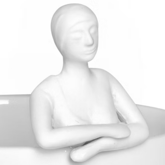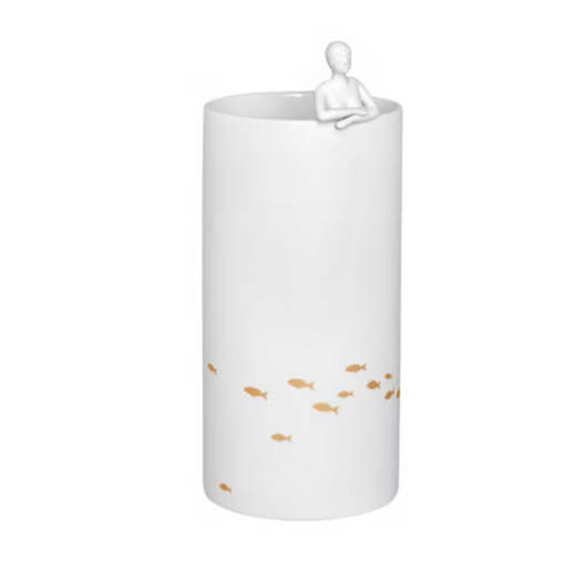 This enchanting cylindrical porcelain vase captures the serene beauty of a bathing pond. The matte exterior contrasts beautifully with the glazed interior, while delicate goldfish swim along the surface. At the top, a tiny swimmer leans dreamily on the edge, adding a whimsical touch. Perfect as a standalone decorative piece or to hold flowers, it brings elegance and charm to any space.