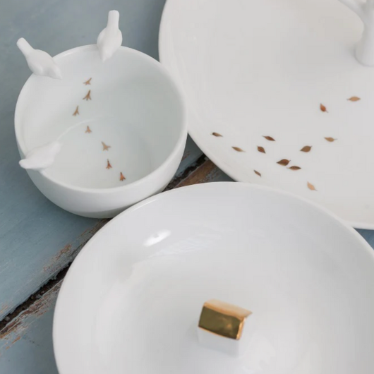 Delight in the charm and elegance of the Porcelain Stories Decorative Bird Bowl. This beautifully handcrafted porcelain dish features a flock of delicate three-dimensional birds walking on golden feet, guarding the treasures inside. Subtle gold accents and a glazed interior contrast with the matte exterior and birds, creating a sophisticated and whimsical piece.