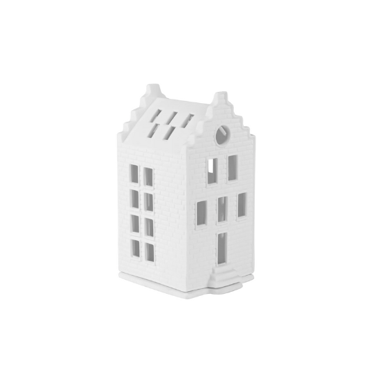 Beautiful Village House Brick House with Stepped Gable is a work of mason craftsmanship. Beautiful brick work combined with the architectural feature of a stepped roof, make this home a wonder of detail. Beautiful white porcelain features sculptural texture. Home is reminiscent of older homes in Holland and Germany. House sits atop a porcelain base plate. Available in multiple sizes.Rader Design:-