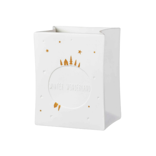 Räder Design Porcelain Light Bag – Winter Wonderland Looking for a unique and stunning gift? This beautiful porcelain light bag is designed in the style of a paper bag and features an embossed world with the words Winter Wonderland, surrounded by charming gold houses and stars for a festive touch. Perfect as a standalone decoration or as part of a collectible set, it brings warmth and magic to your Christmas décor. Carefully handcrafted and packaged in a branded box, it makes a wonderful gift for loved ones — and collecting all four styles creates an immersive festive display. Material: Porcelain, unglazed