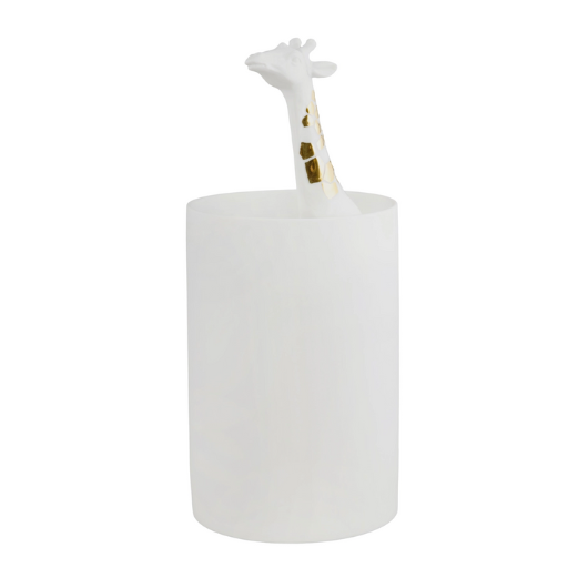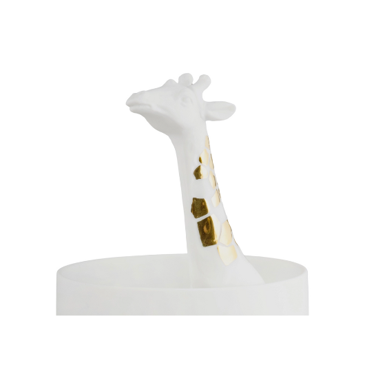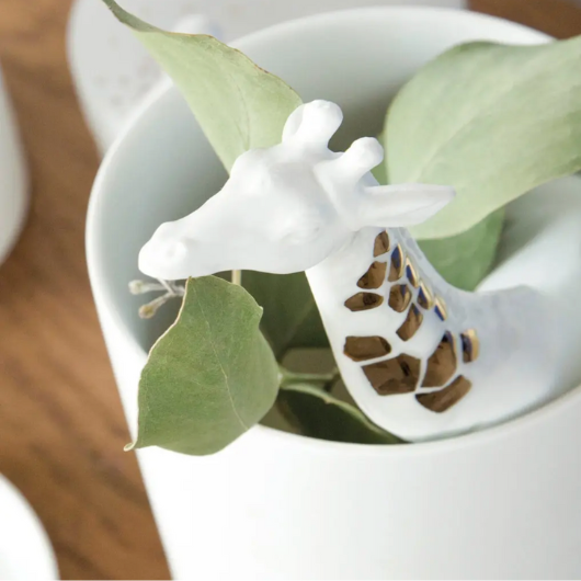 This charming and unusual porcelain vase is full of character, featuring a three-dimensional giraffe gracefully peeking over the rim. Hand-painted gold markings run elegantly down its neck, adding a touch of sophistication. Glazed on the inside to hold water and finished with a matte, unglazed exterior, it looks stunning with a simple sprig of greenery or a full bouquet.