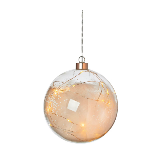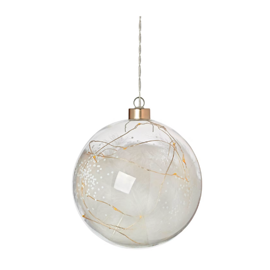 Bring a touch of elegance and magic to your festive décor with our large Feathered LED Bauble. Filled with genuine feathers and glowing with a warm white light, this exquisite bauble creates a soft, inviting ambiance anywhere it’s displayed. Battery operated (2xAAA) and featuring a convenient 6/18-hour timer, it can also be controlled remotely via an infrared receiver module (remote sold separately; batteries not included).