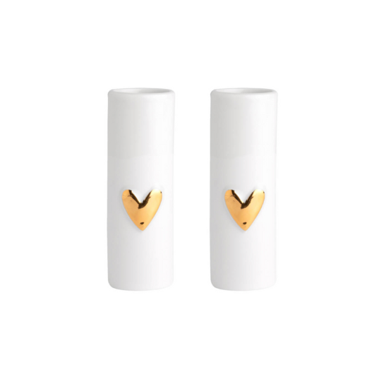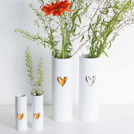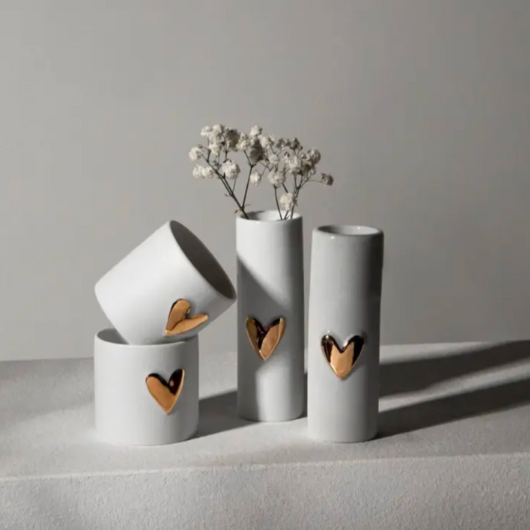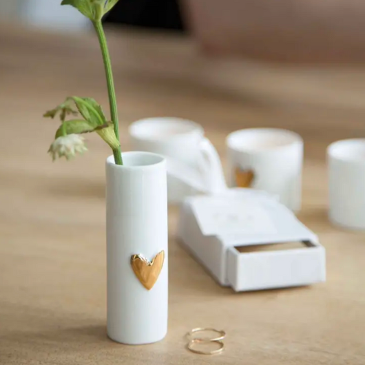 This beautiful set of boxed porcelain vases features a delicate gold heart detail, adding a touch of warmth and elegance to any space. Perfect for displaying single stems, these petite vases offer a simple yet stunning way to showcase flowers. Glazed on the inside and part-glazed on the outside, the combination of finishes adds lovely texture and contrast.