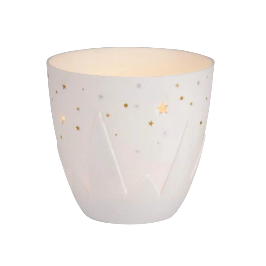 When a tealight is placed inside, it casts a warm, poetic glow — tiny points of light dancing across the porcelain like stars in a winter sky. Perfect for dreamers, stargazers, and cosy evenings alike.