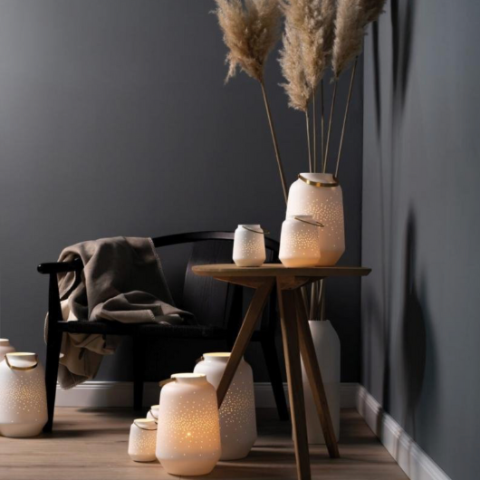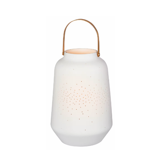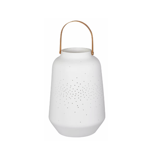 Timeless and elegant, this small porcelain lantern from Räder Design is both decorative and practical. Inspired by traditional Japanese red paper lanterns, its dotted perforations allow light to shine through like stars in the night sky — creating a soft, magical glow. Beautifully delicate yet sturdy, the lantern features a solid base and a strong brass carrying handle, blending classic craftsmanship with contemporary design.