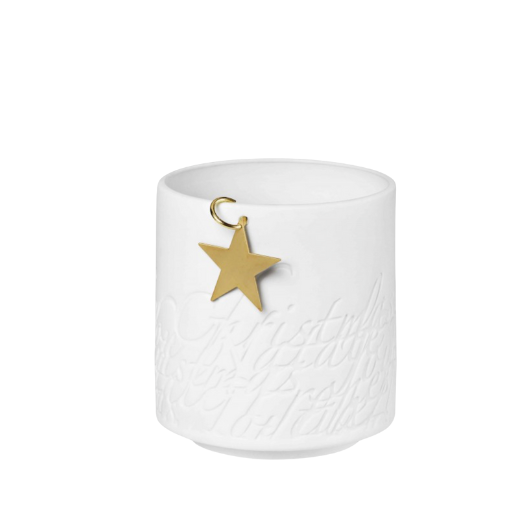 Rader Designs. Beautiful tealight with the word “Christmas” punched out in different languages. A small gold metal star hangs from the tealight. What a lovely gift for the dark winter days! Pairs beautifully with the large version, item number 89630.