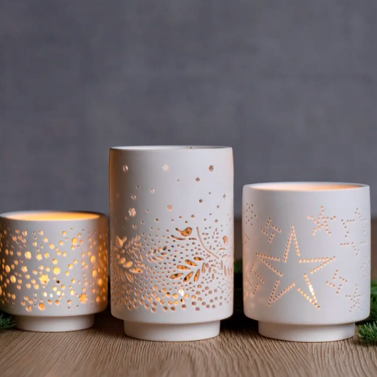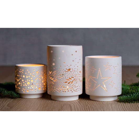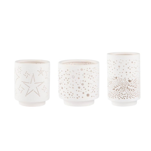 Illuminate your home with this elegant set of three porcelain tea light holders by Räder Design. Crafted from matte porcelain and featuring delicate openwork patterns, these stylish holders cast enchanting light and add a touch of sophistication to any room. Perfect for year-round use, the set comes beautifully packaged in a gift box.