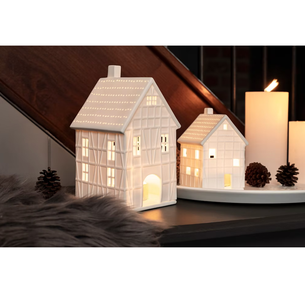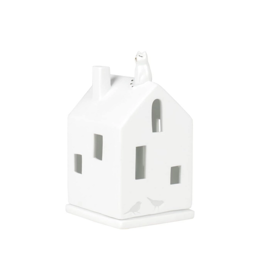 Illuminate your home with this adorable porcelain tea light house featuring a charming cat sitting atop the rooftop with a porcelain candle plate. The cat is adorned with golden accents and a glazed tail and face, the house features intricate paw prints and bird debossings, making it a whimsical and enchanting addition to any room. Crafted from high-quality porcelain, this tea light house is both durable and easy to clean, ensuring that it will last for years to come.