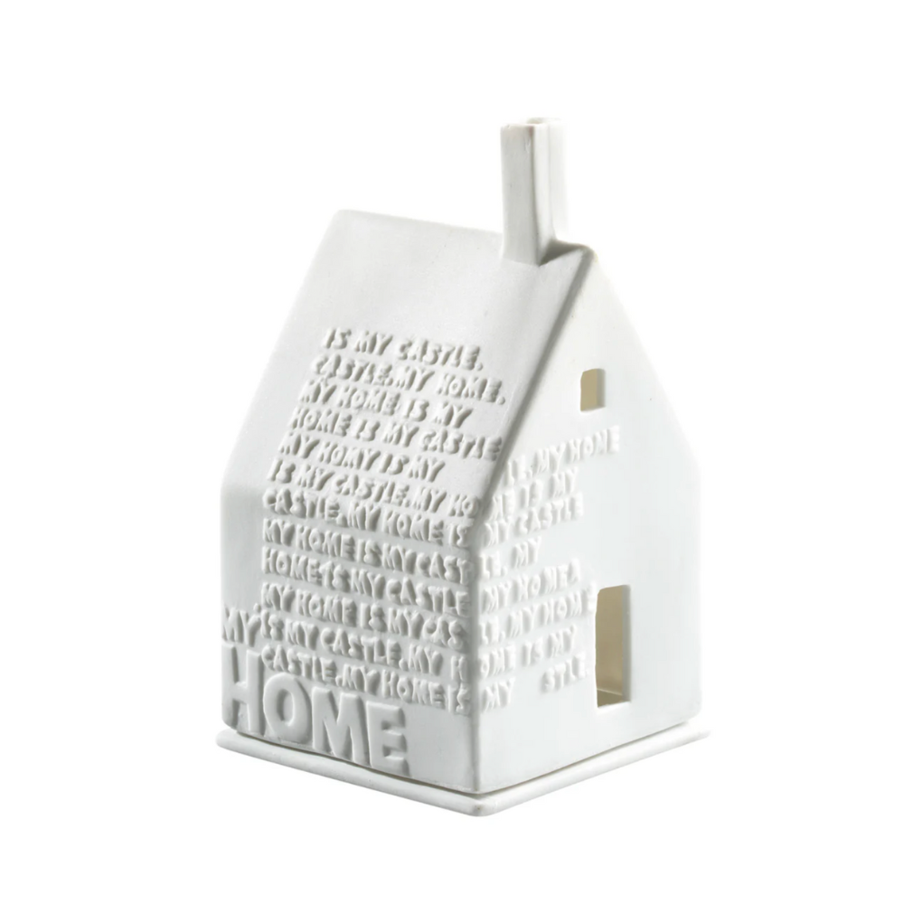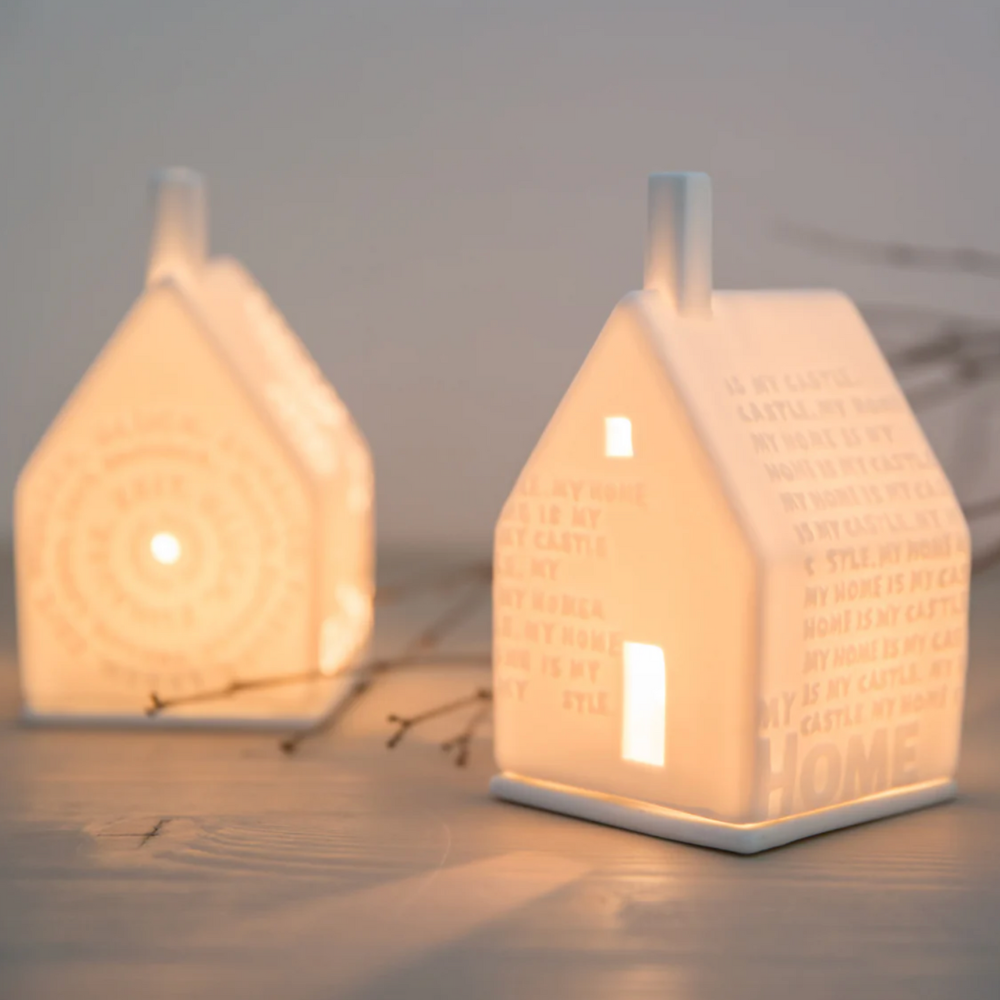 This design features these words artfully written on the roof and sides of the home. The porcelain of this small house is delicate enough that warm light not only shines through the small cutouts in the home, but also glows through the porcelain, illuminating the entire home. Beautiful house sits atop a porcelain base plate.